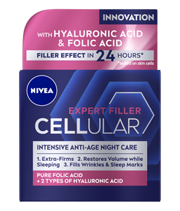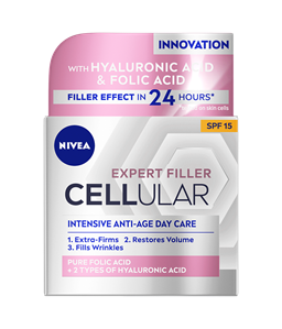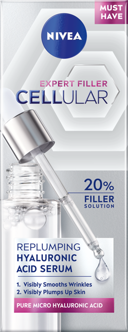 Aqua, Glycerin, Methylpropanediol, Cetearyl Alcohol, Dicaprylyl Carbonate, Dibutyl Adipate, Caprylic/Capric Triglyceride, Distarch Phosphate, Lauroyl Lysine, Folic Acid, Sodium Hyaluronate, Creatine, 1-Methylhydantoin-2-Imide, Magnolia Officinalis Bark Extract, Tocopherol, Sodium Stearoyl Glutamate, Ethylhexylglycerin, 1,2-Hexanediol, Acrylates/C10-30 Alkyl Acrylate Crosspolymer, Sodium Chloride, Sodium Hydroxide, Phenoxyethanol, Limonene, Linalool, Citronellol, Benzyl Alcohol, Geraniol, Alpha-Isomethyl Ionone, ParfumSerums ar tīru folijskābi, kas stimulē kolagēna izdalīšanos, lai āda kļūtu tvirtāka un pilnīgāka, un mikro un makro hialuronskābes molekulām, kas aktivizē ādas šūnas*, lai palīdzētu novērst ādas novecošanās pazīmes. Pierādīti rezultāti: - Tūlīt ievērojami uzlabojas ādas mitrināšana. Izlīdzinās ādas tekstūra. - Pēc 2 nedēļām: uzlabots ādas tvirtums un elastīgums. - Pēc 4 nedēļām: ādas tekstūra kļūst līdzenāka, redzami aizpildītas grumbas. * Par 50% vairāk hialuronskābes salīdzinājumā ar CELLULAR Expert Filler dienas krēmu. * testēts uz ādas šūnām. Piemērotība ādai ir DERMATOLOĢISKI PĀRBAUDĪTA. Piemērots arī jutīgai ādai.