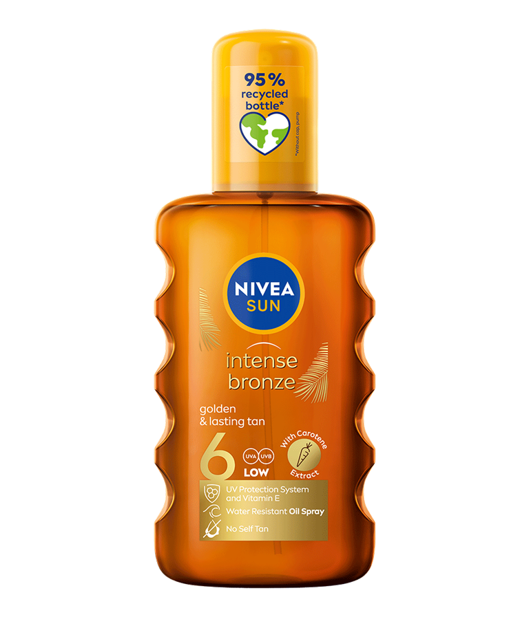NIVEA SUN Intense Bronze izsmidzināma eļļa aizsardzībai pret sauli ar SPF6 nodrošina aizsardzību pret UVA/UVB starojumu un radīts zeltainam, intensīvam un ilgstošam iedegumam.