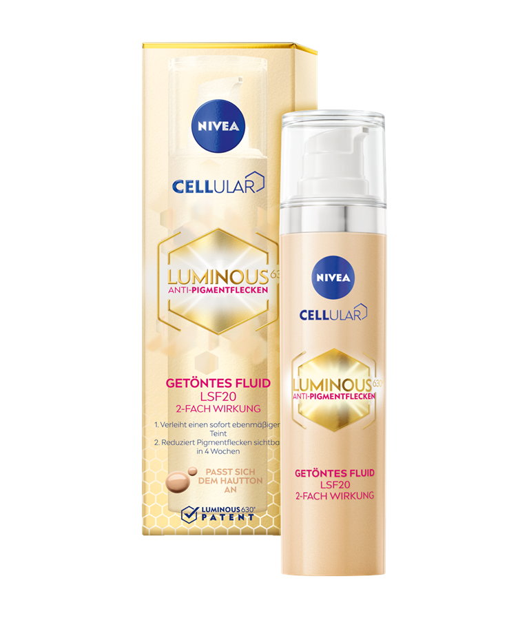 NIVEA CELLULAR LUMINOUS630® ANTISPOT DIVKĀRŠAS IEDARBĪBAS TONĒJOŠS FLUIDS AR SPF20 "IZLĪDZINA ĀDAS TONI. SAMAZINA PIGMENTĀCIJAS PLANKUMUS 4 NEDĒĻU LAIKĀ."