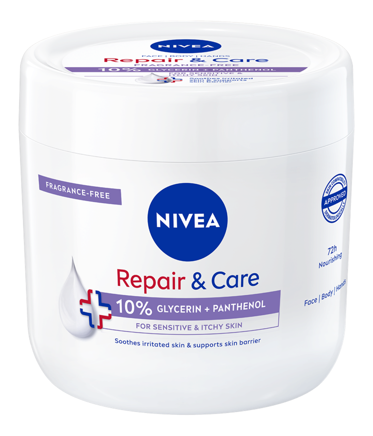NIVEA REPAIR & CARE KRĒMS SEJAI, ĶERMENIM UN ROKĀM AR 10% GLICERĪNA UN PANTENOLU