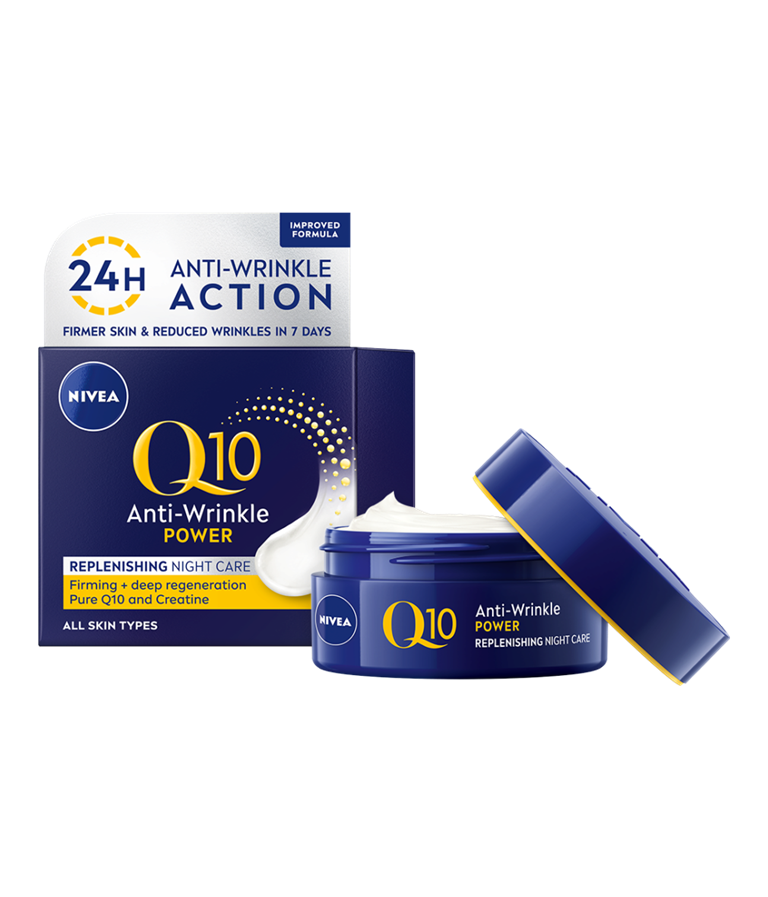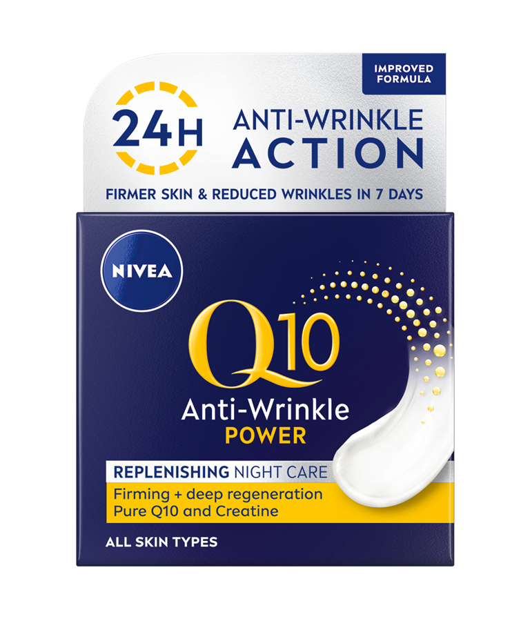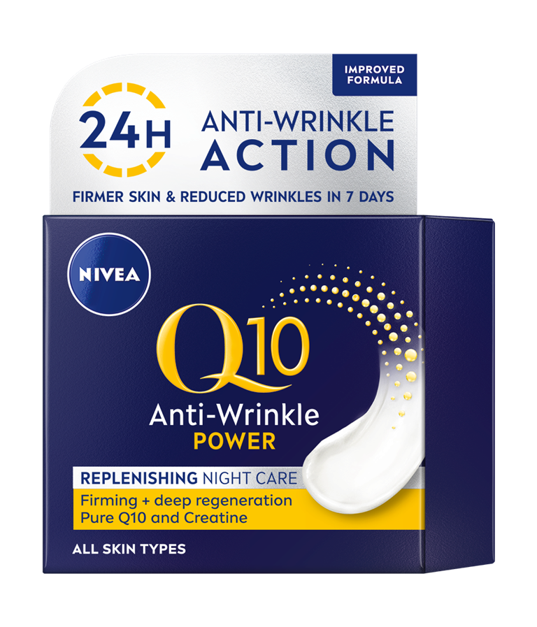 NIVEA Q10 ANTI-WRINKLE POWER atjaunojošs nakts krēms pret grumbām ar divkāršas iedarbības tīru Q10 un kreatīnu