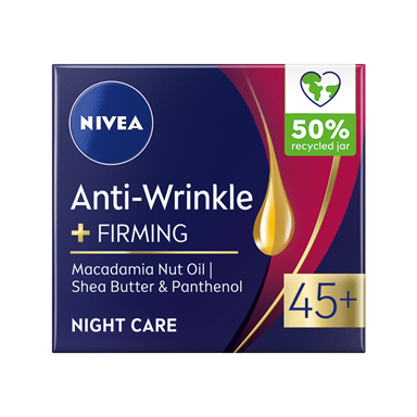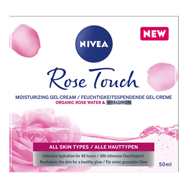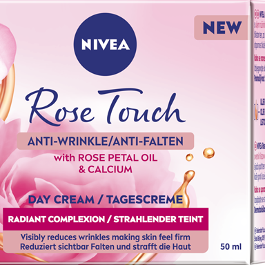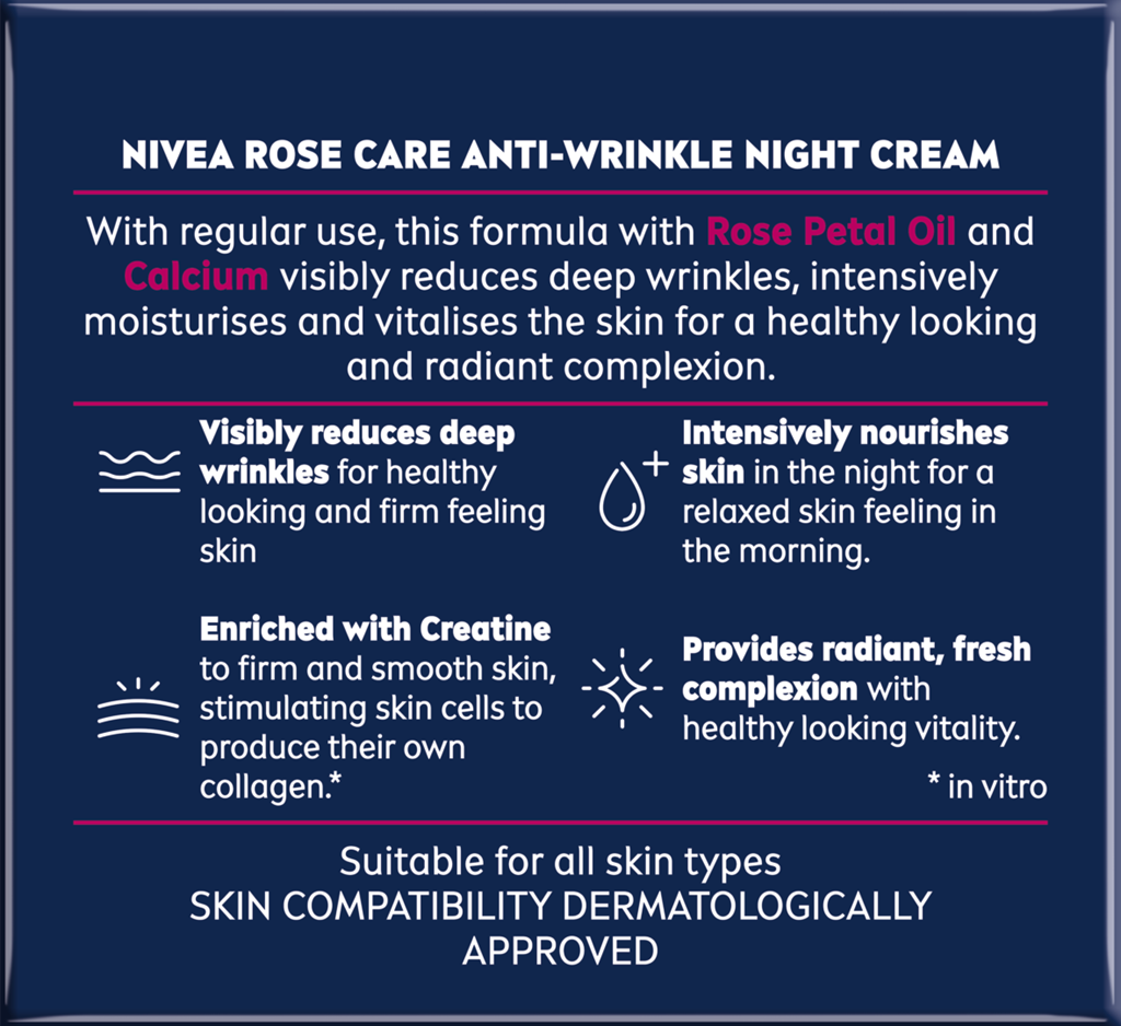 NIVEA ROSE TOUCH nakts krēms pret grumbām ar rožu ziedlapiņu eļļu, kalciju un kreatīnu.