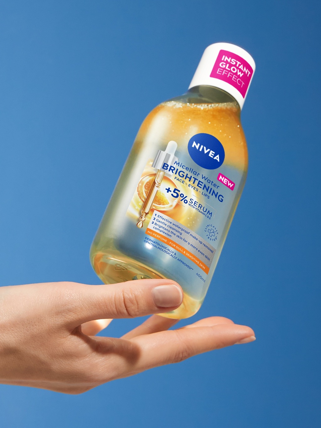 Bagātināts ar C vitamīnu mirdzumam un Hialuronskābi dziļai mitrināšanai, NIVEA Skin Glow ar serumu bagātināts micelārais ūdens attīra, mitrina un piešķir ādai mirdzumu vienā solī. Maigi noņem grimu un netīrumus, uzlabojot dabisko starojumu un atstājot ādu mirdzošu. Piemērots visiem ādas tipiem — Skin Glow nodrošina, ka āda jūtas maiga, gluda un starojoša.