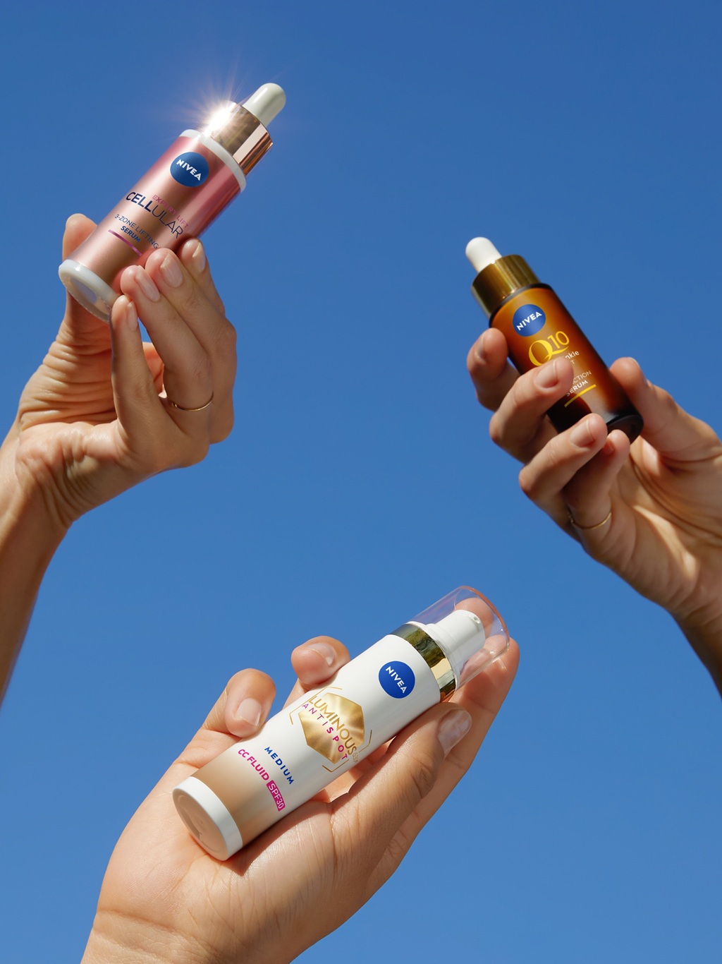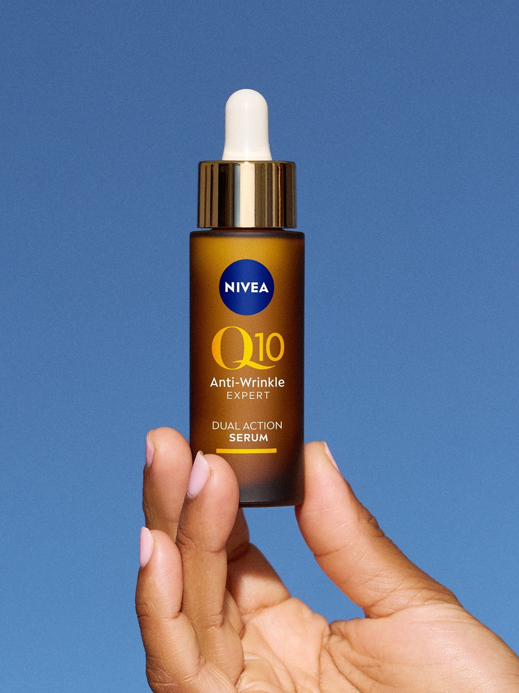 Serums: Uzklāj serumu, pievēršoties zonām, kur vēlies mērķtiecīgi risināt konkrētas vajadzības, piemēram, smalkas grumbiņas vai nevienmērīgu ādas toni. NIVEA Q10 Anti-Wrinkle Power atjaunojošas seruma pērles ir veidotas ar NIVEA Q10 formulu un Kreatīnu, lai palīdzētu aizsargāt ādu no brīvajiem radikāļiem un piešķirtu ādai enerģiju atjaunošanās procesiem.